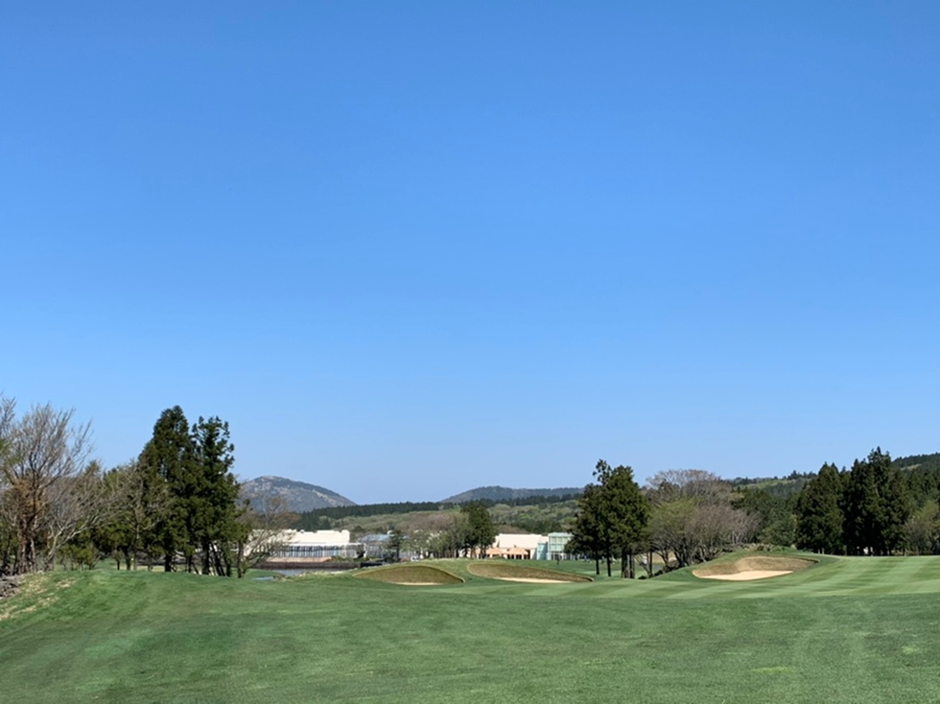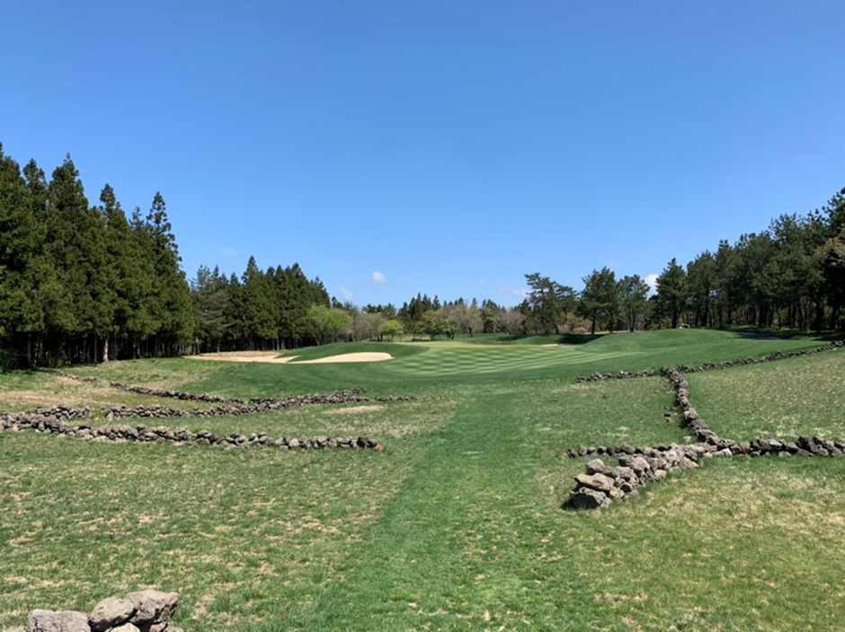 9번홀(파5). 우측의 오름과 좌우의 삼나무 숲, 그리고 저 멀리 한라산이 보이는 아름다운 홀이다.